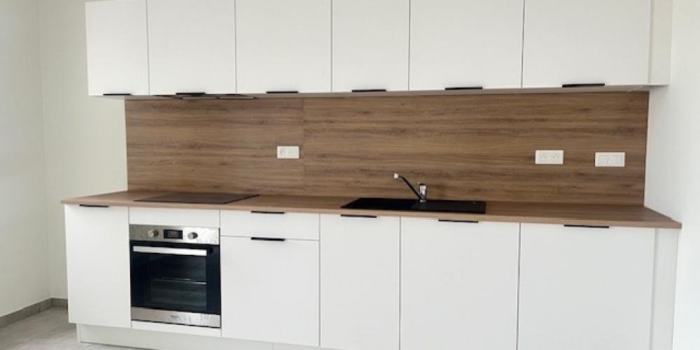 - Cuisine équipée ouverte sur séjour comprenant : plaques vitrocéramiques, hotte, four, meubles et évier + raccord lave-linge