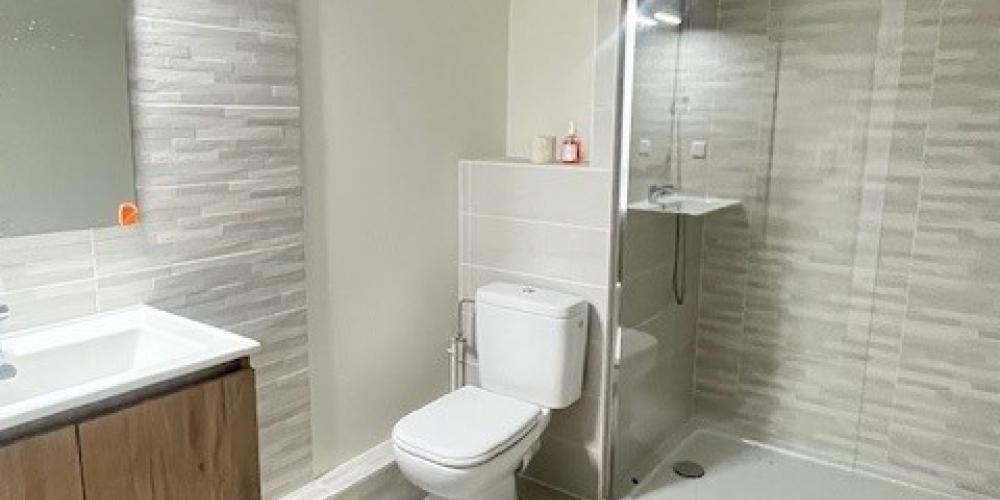 - Une salle de bains comprenant : un meuble vasque, une douche à l'Italienne + paroi, un miroir, un sèche-serviettes et un wc