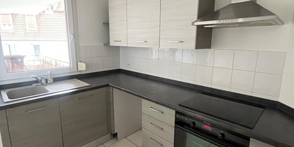 Cuisine équipée ouverte sur séjour comprenant : plaques vitrocéramiques, hotte, four, meubles et évier + raccord lave-linge