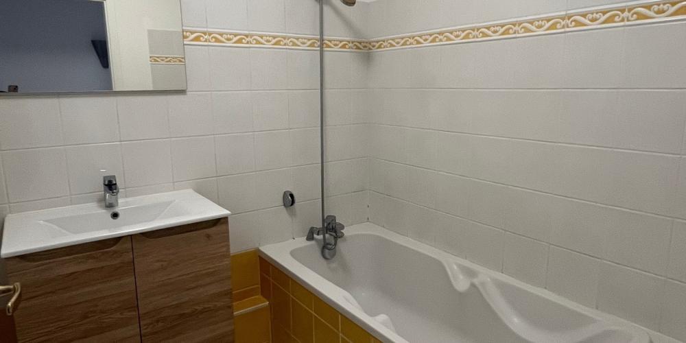 Une salle de bains comprenant : un meuble vasque, une baignoire, un miroir, un sèche-serviettes