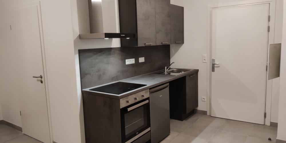 • Kitchenette entièrement équipée ouverte sur séjour comprenant : plaques vitrocéramiques, hotte, four, meubles et évier + raccord lave-linge