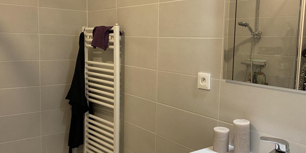 • Une salle de bains comprenant : un meuble vasque, une douche à l'Italienne + paroi, un miroir, un sèche-serviettes et un wc